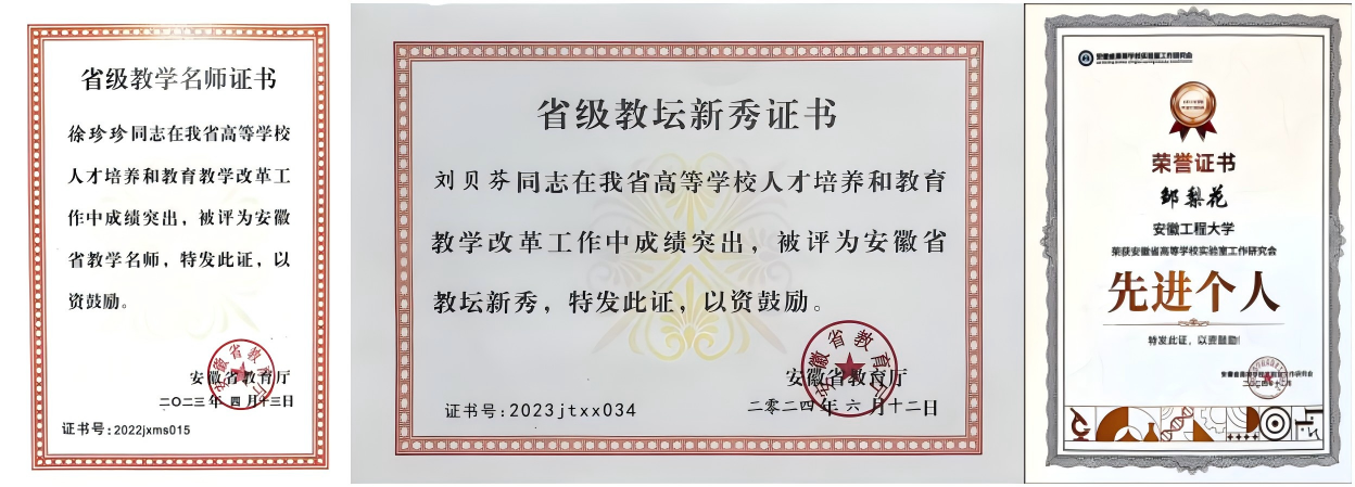 教师教学水平持续提升。近三年,获第三届全国高校教师教学创新大赛安徽省赛一等奖1项,第四届全国高校教师教学创新大赛安徽省赛二等奖1项,安徽省高校青年教师教学竞赛二等奖1项;获未来设计师全国艺术设计教师教学创新大赛国赛二等奖1项、三等奖1项,省赛二等奖1项;获“匠心筑梦 领航未来”全国高校教师技能创新大赛一等奖1项、三等奖4项。