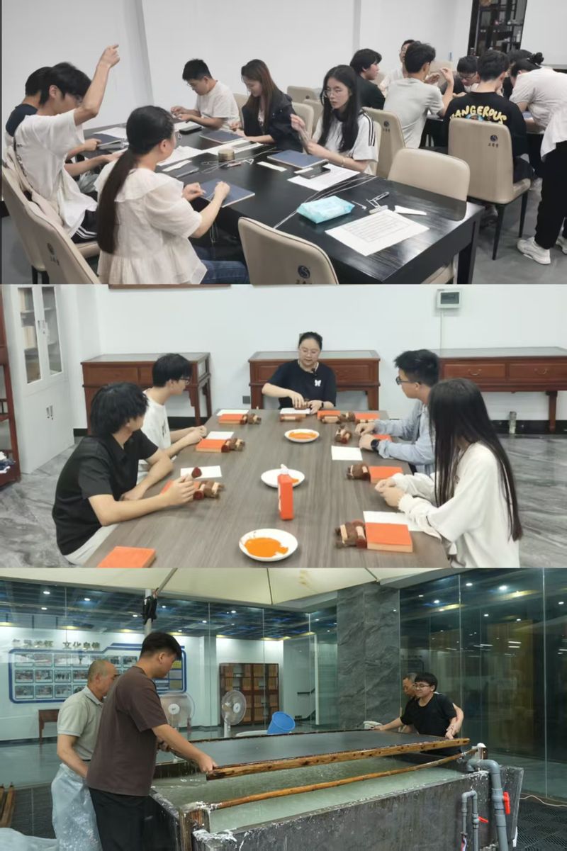 理论滋养心灵,实践深化认知。带着课堂上的思考,同学们旋即投身于线装古籍制作的传统工艺现场。在专业师傅的悉心指导下,大家亲手体验了古法造纸的关键环节——“捞纸”,感受纸浆在竹帘上均匀凝结成宣纸的神奇;在墨香萦绕的工坊里,尝试雕版印刷,体会方寸之间力透纸背的匠心;最后,专注于线装书“穿线”环节,屏息凝神地穿针引线,完成一本线装书的“筋骨”装订。每一次指尖的触碰,都是与跨越千年的工匠对话,古籍不再仅是静态展品,其承载的文化密码与民族智慧在亲手实践中变得鲜活可感。